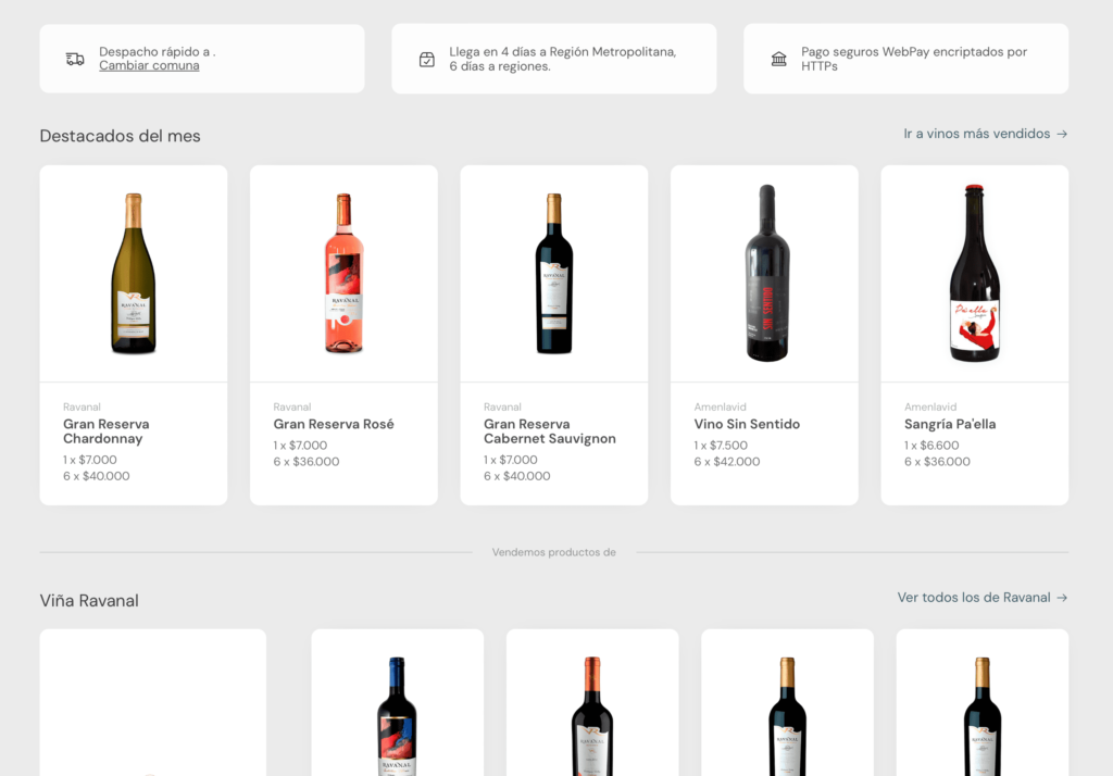 Explora nuestra tienda online y descubre una selección exclusiva de los mejores vinos del mercado. Trabajamos con más de 18 prestigiosas viñas, garantizando calidad y variedad en cada botella. Desde tintos robustos hasta blancos frescos, nuestros vinos están a un clic de distancia, listos para llegar a la puerta de tu casa.